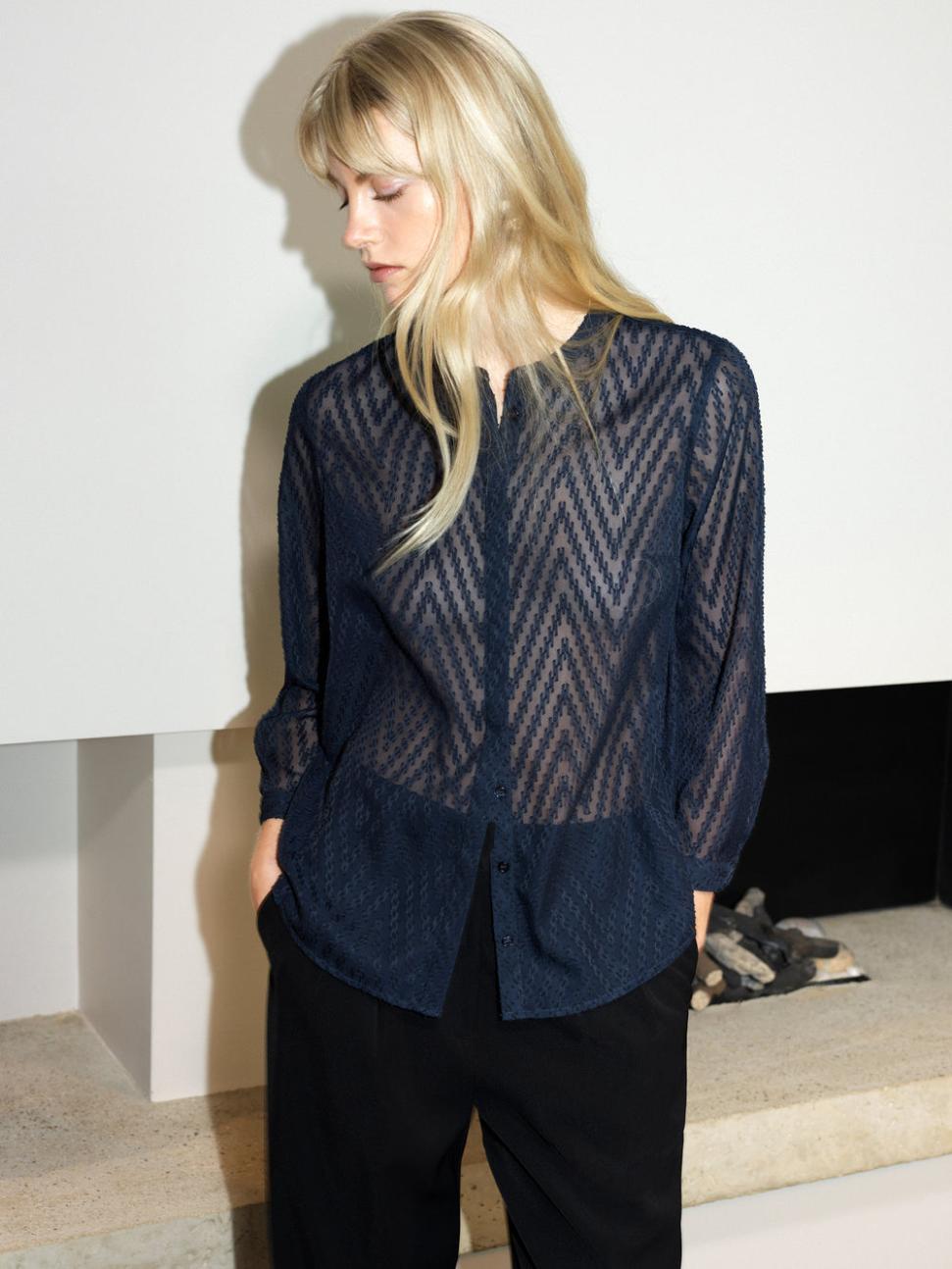 Presentamos la sofisticación semitransparente. Nuestra camisa de manga larga Dayton Fil De Coupe luce un estampado de chevrón, realzando su silueta con un cuello redondo y cierre oculto de botones.
