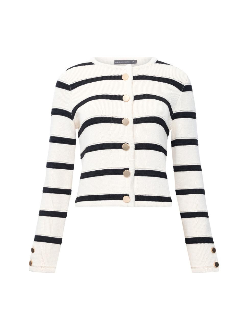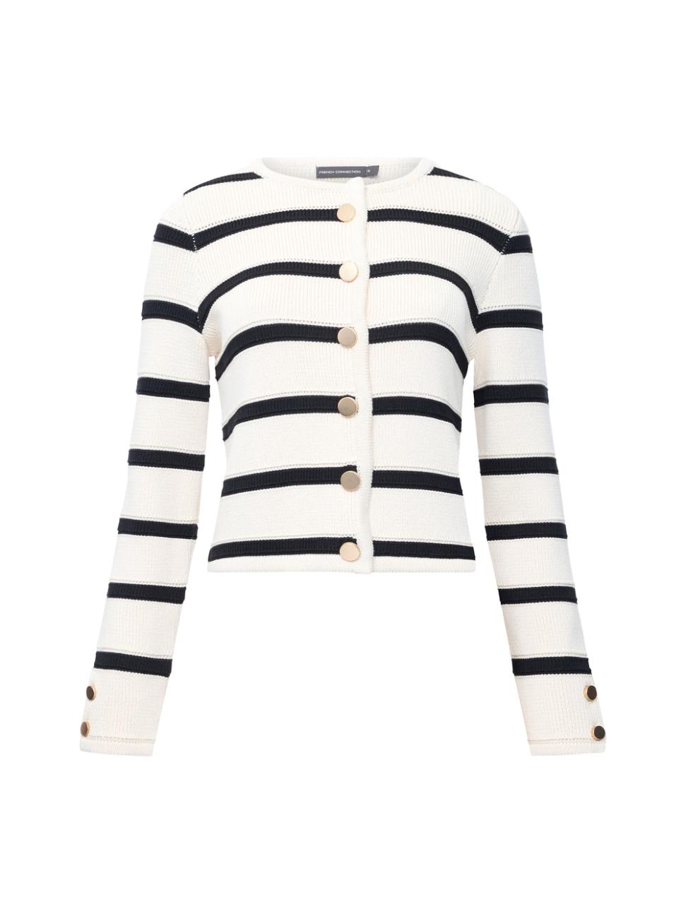 スマートでシック、そしていつでもお出かけできる。ストライプ柄ニットコーティガンは、大胆なストライプ、テーラードシルエット、洗練されたゴールドトーンのボタンが特徴です。