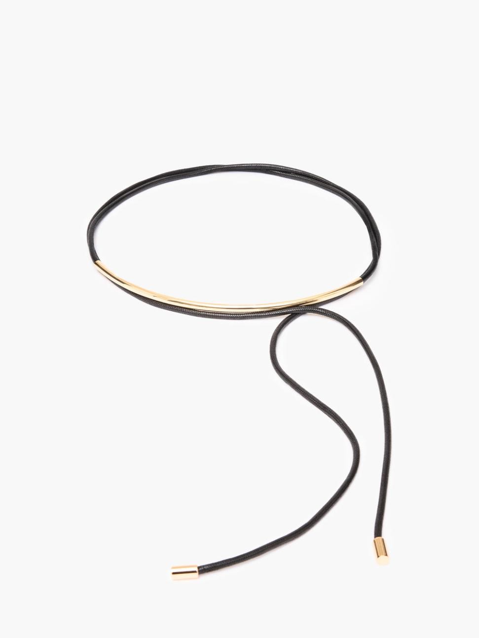 Elegant, skulpturalt och subtilt slående. Vårt rörformade slipsbälte har en rörformad knytkropp, förhöjd av en böjd guldfärgad stång och matchande knäppningar.
