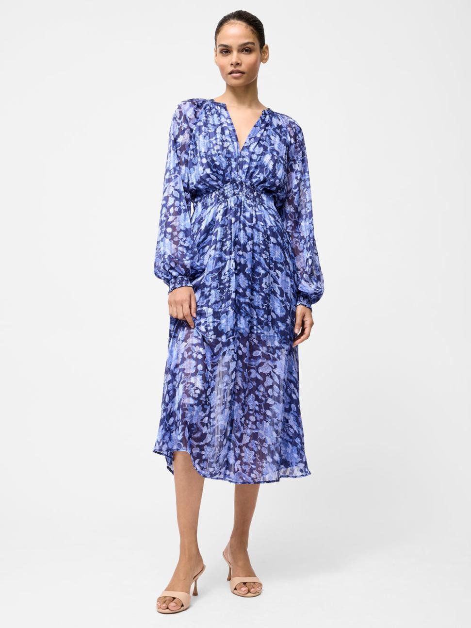 Vår Cynthia Shirred Midi Dress är en garanterad favorit för alla tillfällen. Denna blå blommiga klänning har en smickrande midi-lång silhuett, med v-ringning, långa ballongärmar och en rynkad empiremidja.